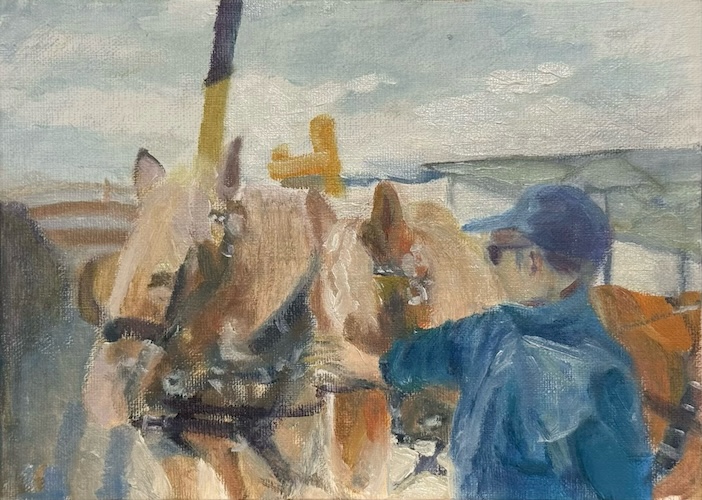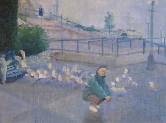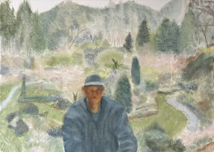 Motherland depicts my first-generation Taiwanese grandfather visiting his parents’ home in China. Beside him stands my mother, wearing a skirt printed with a commanding language; on his other side, a lamp—an object I identified with for its size and jagged glow—lost in its own reflection. The image is based on one of the few photographs I took in the 1990s that captured the presence of all three generations of my family, each of us an immigrant to a new country. It conjures thoughts of our journeys; the bed, a place of rest, shadowing as turbulent waters between continents; and what it means to belong.